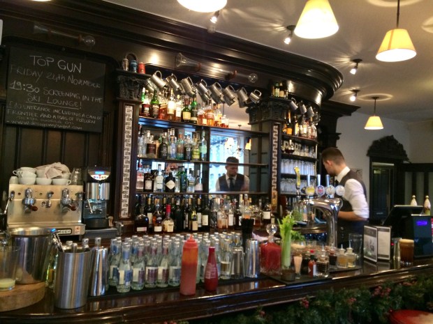 Once we had our drinks, we wandered through the wood-panelled hallways to find a waterside terrace. It was practically deserted, but we chose the warm interior and the log fire to sit beside in the end.