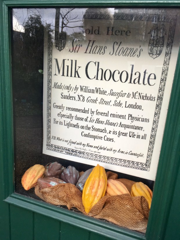 I was very pleased to discover that Sir Hans Sloane and his former home’s gardens are also important for another reason ~ that of the discovery of my most cherished addiction on the planet, chocolate. Though Sloane was not the first to encounter mixing recipes for chocolate and bringing them home to England from his travels in Jamaica, a Soho grocer named Nicholas Sanders jumped at the chance to capitalise on Sir Hans Sloane’s famous name and marketed his chocolate recipe as Sloane’s own ‘brand’. Check out the advert below!