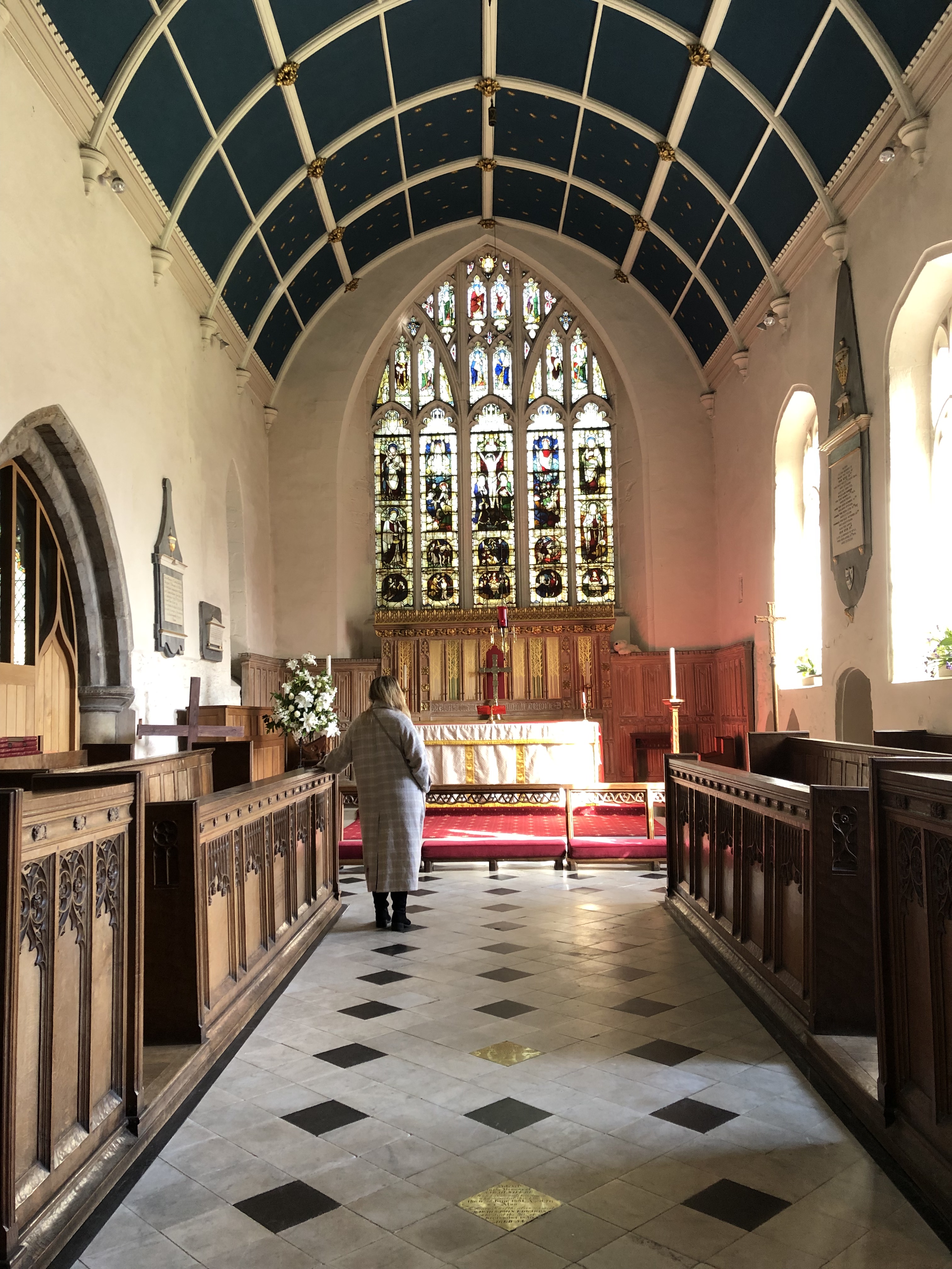 I took this picture of my sister quietly surveying All Saints’ altar and standing among the choir pews, these being the largest we saw on our tour. I watched her run her hand along the ornate wood, smoothed by hundreds of years of singers’ hands and hymnals. A familiar feeling to my sister and me, having both sung in the Chapel Choir when we were young. This church has a pleasant, well-cared-for energy and it was Cha’s favourite from the day when we sat down to discuss later on.
