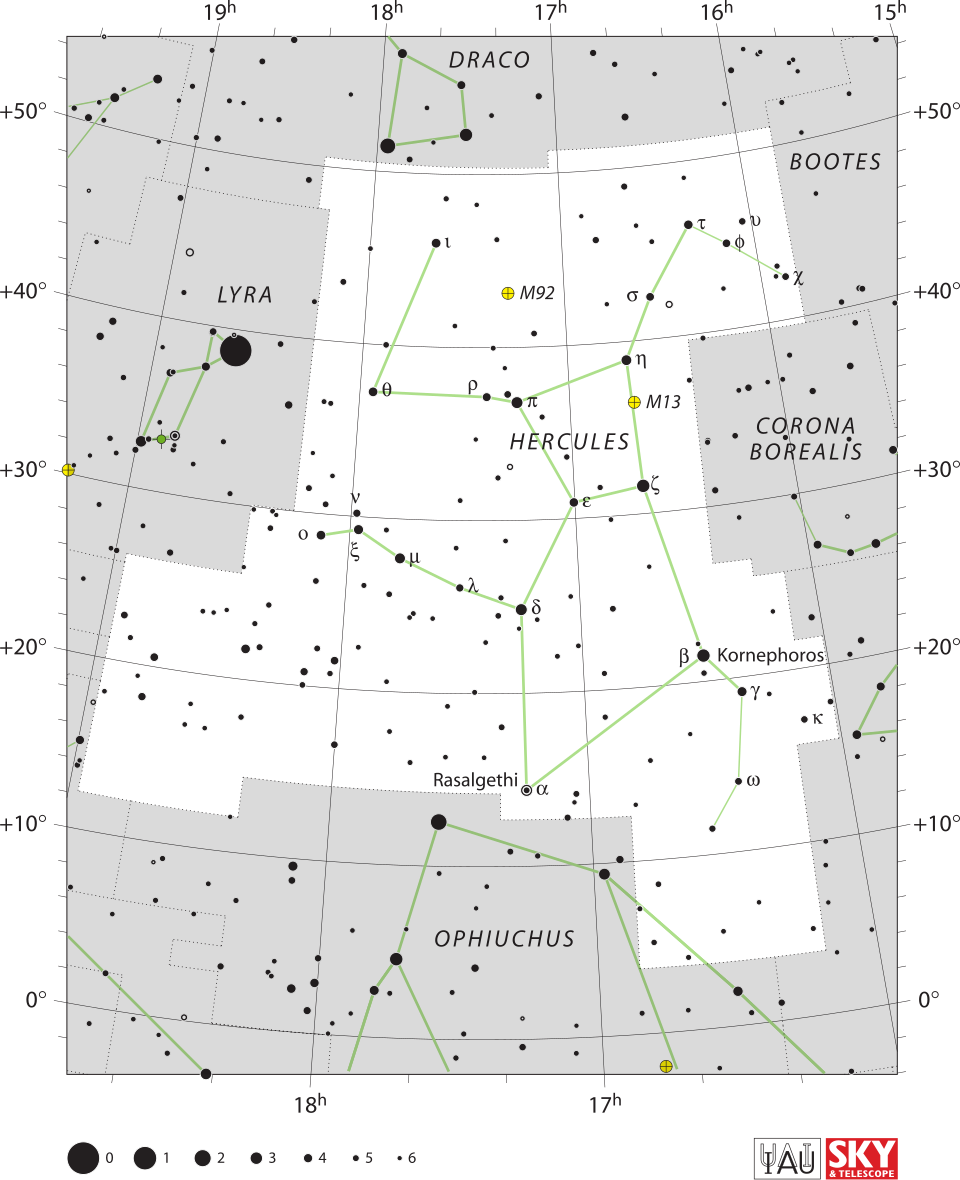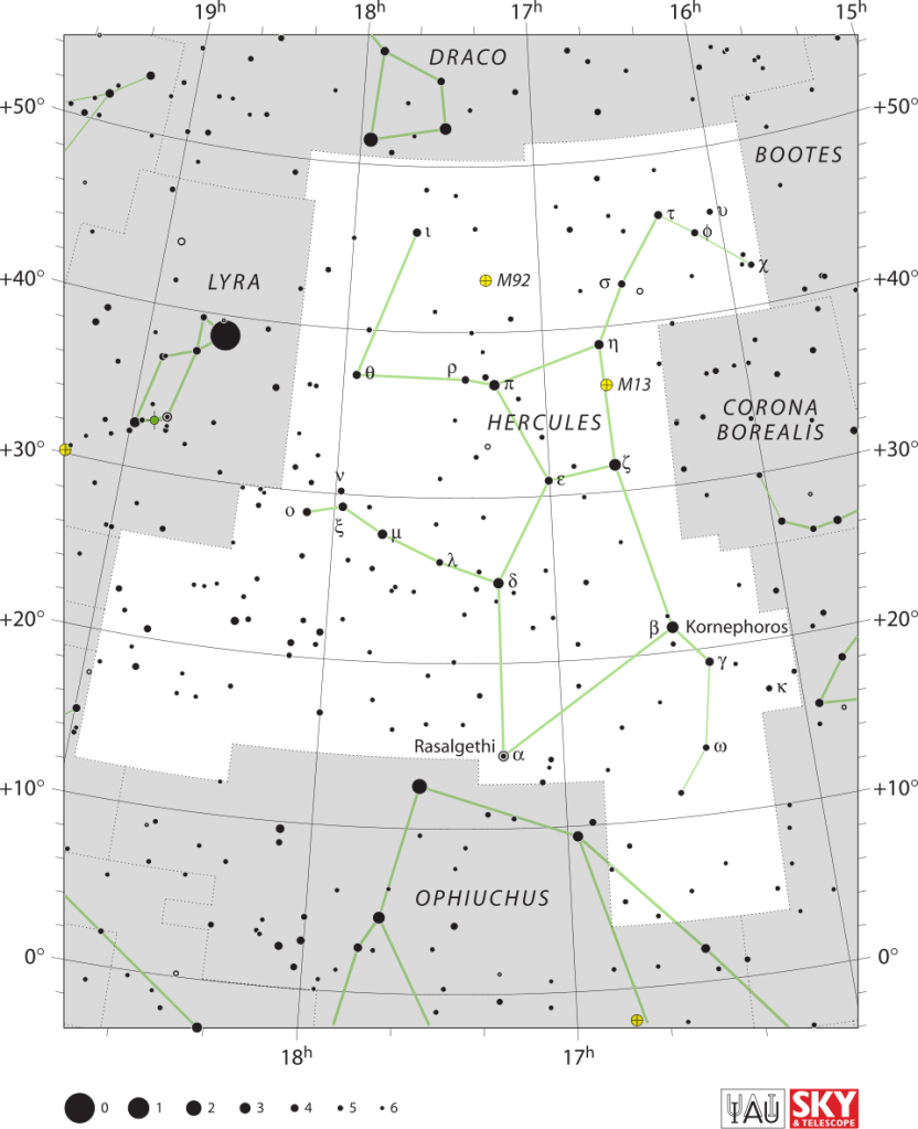 This is a map of the constellation named after Herakles – ‘Hercules’ – the Romanisation of Herakles. Hercules was one of the 48 constellations listed by the 2nd century astronomer Ptolemy (pronounced ‘Tolemy’ – love this name) and remains among our 88 modern day constellations. This formation is said to be Herakles himself fighting the dragon of the Hesperides, Draco, ‘holding his lion skin in his left hand and a club in his right’. Or, indeed, subduing Cerberus as depicted in this fascinating astrological postcard from circa 1825: